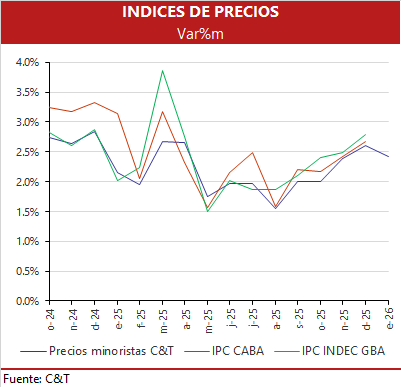 El relevamiento de precios minoristas de C&T para la región GBA presentó un alza mensual de 2,4% en enero, la cual fue más baja que en diciembre, rompiendo la tendencia al alza de los meses previos. La variación de doce meses fue de 29,2%.