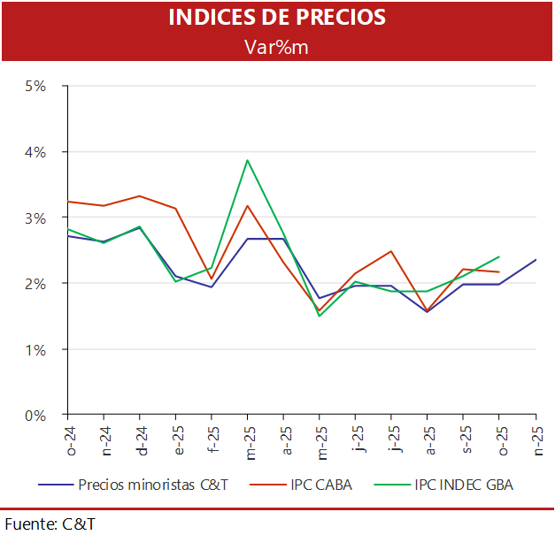 En noviembre, el relevamiento de precios minoristas de C&T para la región GBA tuvo un incremento mensual de 2,4%, coincidiendo con el valor que había informado el INDEC para la región en octubre. La variación de doce meses se redujo levemente y quedó en 29,1%.