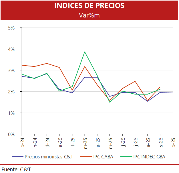 El relevamiento de precios minoristas de C&T para la región GBA presentó un incremento de 2% mensual en octubre, coincidiendo con el de septiembre. Así, la variación de doce meses se redujo levemente de 30,3% en septiembre a 29,3%.